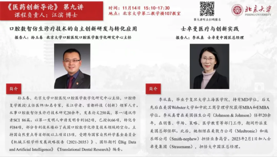 2024年11月14日,士卓曼荣幸受邀参加了由北京大学创新创业学院开设的《医药创新导论》系列特色课程第9课。此次课程聚焦口腔领域的医药创新实践,士卓曼中国区总经理李从真女士与北京大学口腔医院口腔医学数字化研究中心的孙玉春教授作为嘉宾分享了口腔领域最新的创新成果与实践应用。